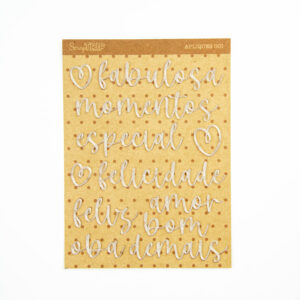 Nosso kit é composto de 12 elementos, sendo 9 palavras bastante abrangentes que se encaixam em diferentes contextos para você criar as páginas mais lindas e perfeitas de scrapbook!