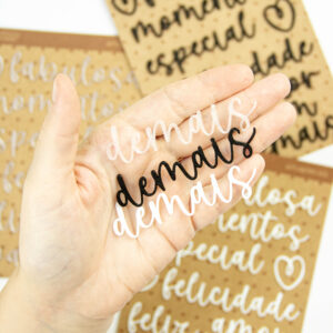 Nosso kit é composto de 12 elementos, sendo 9 palavras bastante abrangentes que se encaixam em diferentes contextos para você criar as páginas mais lindas e perfeitas de scrapbook!